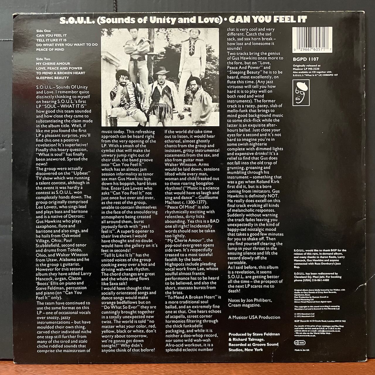 90年代のUKリイシューです。オハイオはクリーヴランドを代表するファンク・グループS.O.U.L.のセカンド・アルバム。タイトル曲「CAN YOU FEEL IT」を始め「TELL IT LIKE IT IS」STEVIE WONDER「MY CHERIE AMOUR」のカバー、M.O.P.「ROLL CALL」でサンプリングされた「PEACE OF MIND」等、捨て曲無しのレア・グルーヴ人気盤。