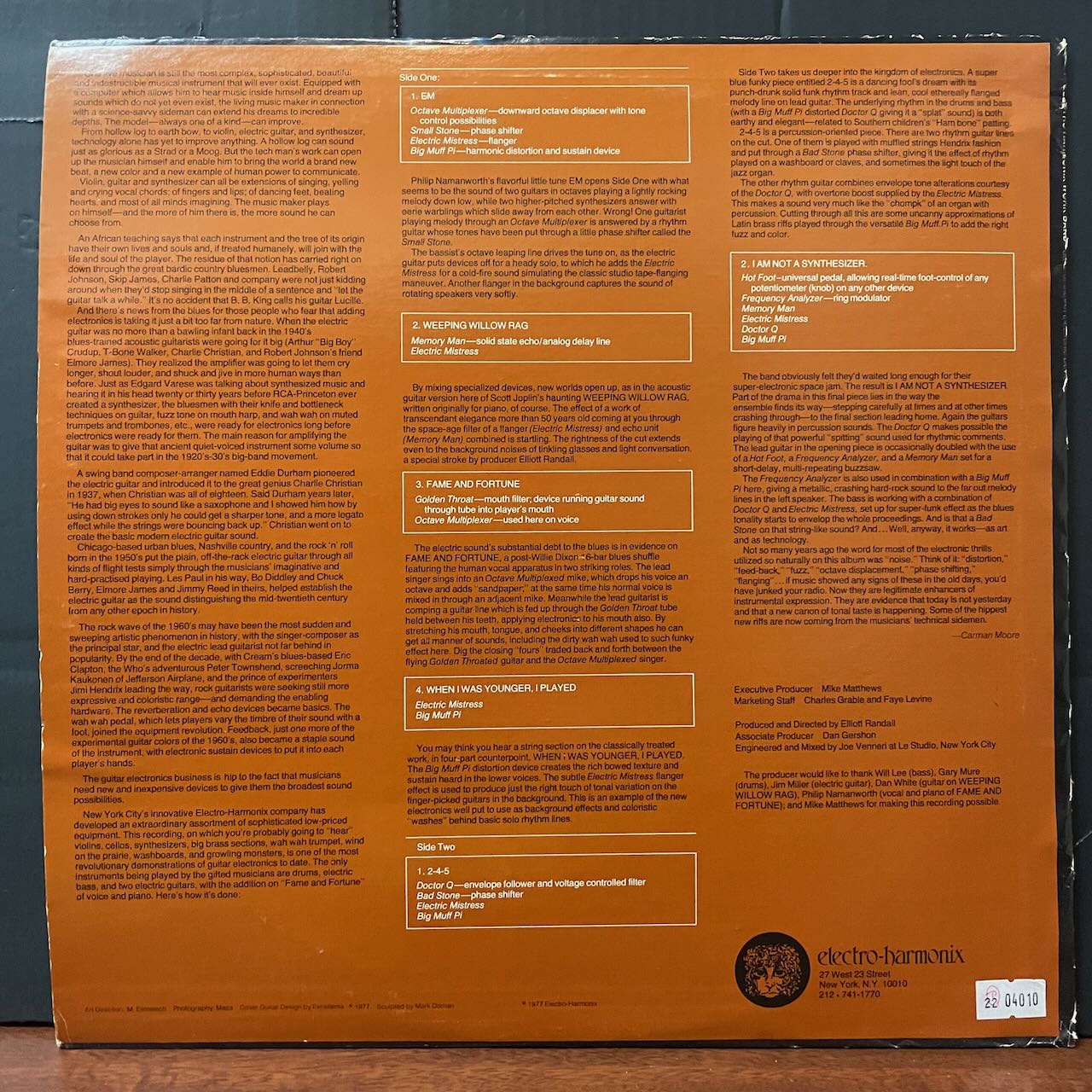 ギターエフェクトペダルのメーカーELECTRO-HARMONIXがリリースした販促用アルバム。変則的なドラムブレイクで始まるジャズ・ロック「I AM NOT A SYNTHESIZER」こちらもタイトなドラムのジャズ・ファンク「2-4-5」等、収録。