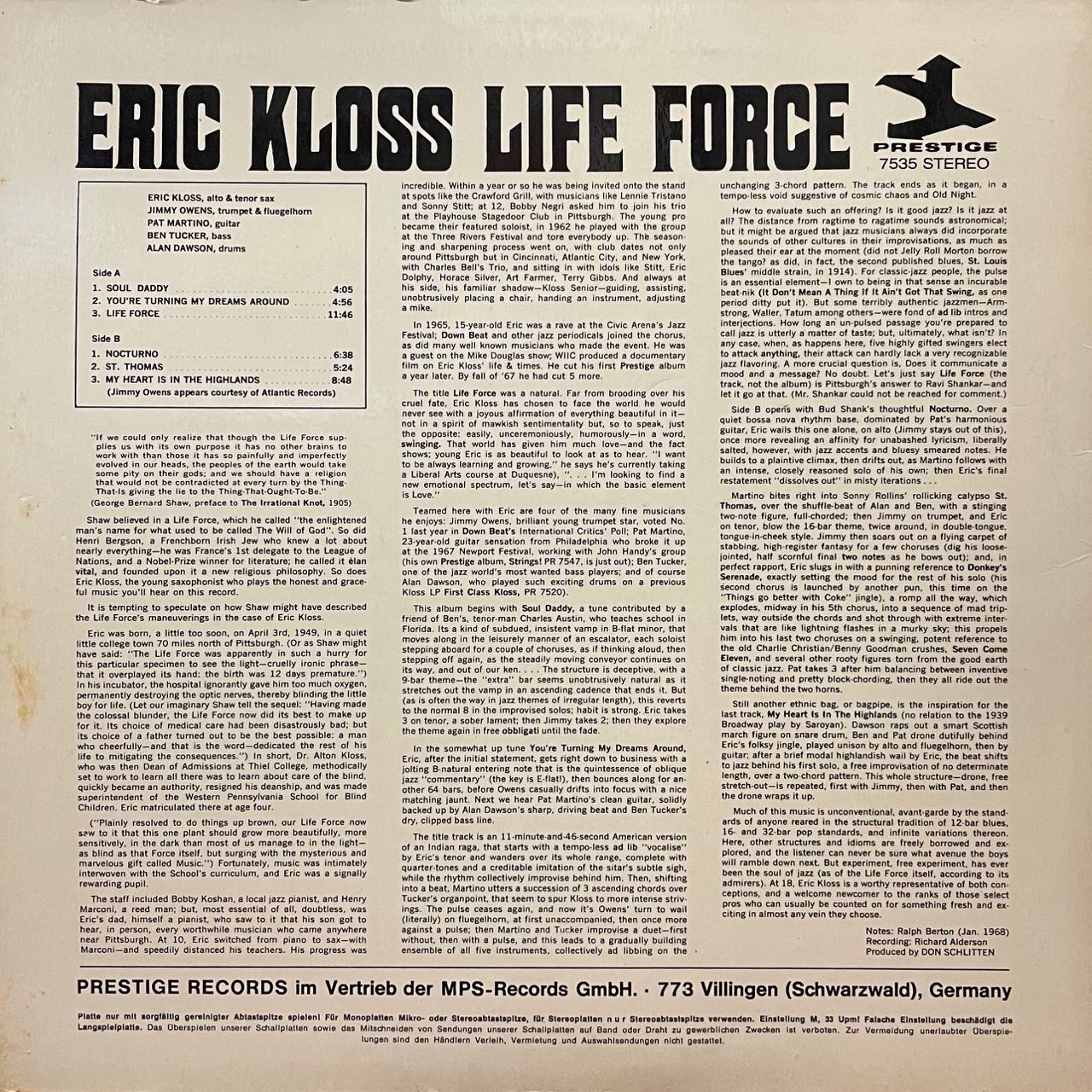 盲目のサックス奏者ERIC KLOSSの68年作。渋いソウル・ジャズ「SOUL DADDY」収録。