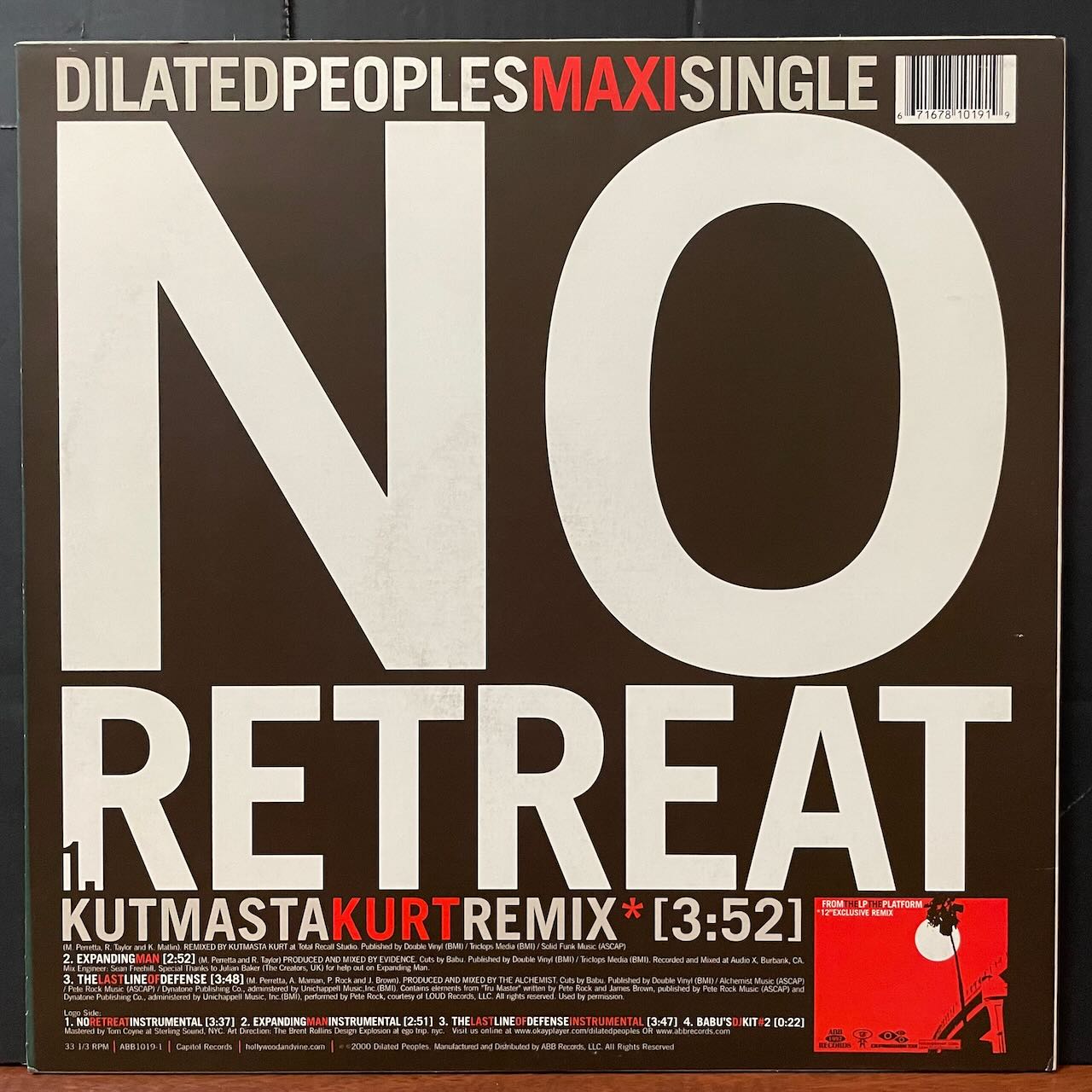 KUTMASTA KURTによる「NO RETREAT」JERUの声ネタも効いてるEVIDENCEプロデュースの「EXPANDING MAN」ALCHEMISTプロデュースの「LAST LINE OF DEFENSE」全3曲間違いないです。